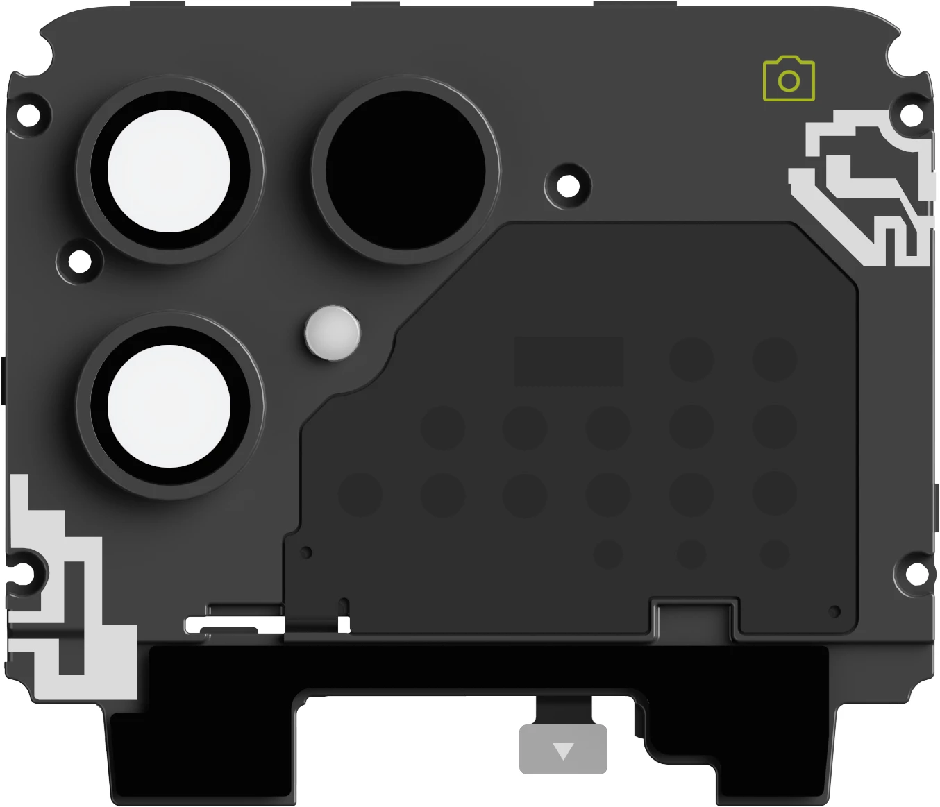 Die Top-Einheit beherbergt den Blitz deiner Kamera sowie den ToF-Sensor. Der Kamerablitz dient auch als Taschenlampe, während der ToF-Sensor eine wichtige Rolle bei der Bildnachbearbeitung spielt. Dies wird auch zur Objekterkennung verwendet, was für bestimmte KI- und AR-Funktionen nützlich ist. Die einzelnen Kameraeinheiten und das SIM/SD-Kartenfach sind separat erhältlich.