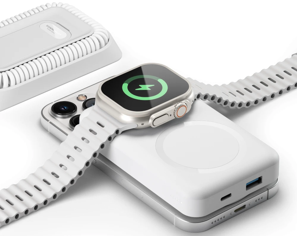 Mit dem integrierten USB-C zu USB-C Kabel sowie den Micro-USB und USB-A Adaptern ermöglicht allroundo Pro die nahtlose Verbindung mit allen Endgeräten. Darüber hinaus bietet es auch einen Apple Watch Ladesockel und unterstützt das kabellose Laden von QI-fähigen Smartphones. Für alle nicht-Apple-Geräte ist ein magnetischer Sticker im Lieferumfang enthalten.